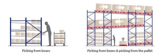 Advantages · Ideal for expiry dated materials · An almost solid volume of usable storage space · Space, manpower and utilities savings · Saves time, space, and labor · Provides high density storage · Cost efficient lShelves can be adjusted to meet product dimensions · Reduces loading and unloading congestion · Application Examples | ![]() |