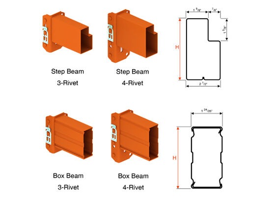 · Sold individually (2 beams required per level) · Manufactured to meet RMI standards · Compatible with most teardrop style uprights · Uses 55 KSI high-strength steel with a 1.67 to 1 safety factor · 14 gauge steel construction | · Abrasion-resistant finish · 1-5/8"d step allows wire or wood decking · Adjusts on 2" centers for custom configurations · Built-in safety clips lock into place when beam has been properly installed |