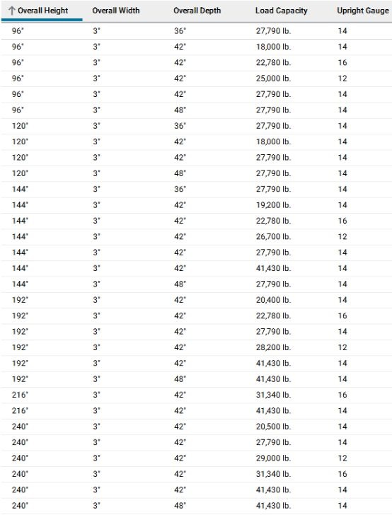 Advantage · Meets RMI standards and specifications · Holds up to 19,380 lbs · Quality, high-strength steel construction · Powder coating for added protection and corrosion resistance · Fully welded upright with support bracing for added rigidity · Teardrop punches on 2” centers for easy assembly · Footplates can be anchored to floor through pre-punched holes · Compatible with accessories such as wall ties and row spacers | Welfor pallet rack frame characters · Upright frames are built from structural channel steel · 3" uprights have 37,410 lbs. capacity; 4" columns have 56,860 lbs. capacity (based on 48" or less vertical beam spacing and other factors) · Steel thickness, especially in corner sections, enables greater resistance to fork truck impact damage, while increasing load carrying capacity and resistance to seismic forces · Upright frames are punched on 4" vertical centers Beam connector clips are specially punched to allow for vertical adjustability in 2" increments · Diagonal and horizontal braces are used throughout the entire frame. Braces are 2" x 2" and 1.5"x1.5" structural angles, welded to the columns · Footpads are made of 7-gauge steel plates, and are welded to each column, efficiently dispersing floor loads |