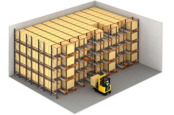 Radio Shuttle Pallets Racks are a semi-automated solution for the storage of high-volume palletized goods and mass storage products. They are often used in warehouses and distribution hubs for food, beverages, or warehouses with special storage conditions. A shuttle is a sort of cart or sled that moves stored items into the pallet racking. The shuttle runs on tracks and allows for a storage system of much higher density so that space can be utilized to its highest potential. Shuttle racking removes the need for human operators to manoeuvre forklifts up and down aisles, reducing risk to warehouse workers, machinery, pallet racks themselves and saving time. This type of system is best for warehouses that are frequently loading and unloading large number of pallets such as cold storage, meat processing, food and beverage distribution, etc. However, it is not useful for distribution centres where there are multiple items stored in each pallet and along each lane.