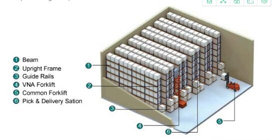 · Narrow aisle pallet racking is a special pallet rack with small aisle · VNA pallet racking can save more aisle to largen storage space · VNA pallet racking is easy install/dismantle · VNA pallet racking can load 1-2T/pallet, each level can load 4500kgs max; · level height can be adjusted by 75mm per pitch freely; | · VNA pallet racking suits almost all types of palletized goods · Rapid through put and handling · Lowest level pallets can be placed on the floor · VNA pallet racking need special forklift match it |