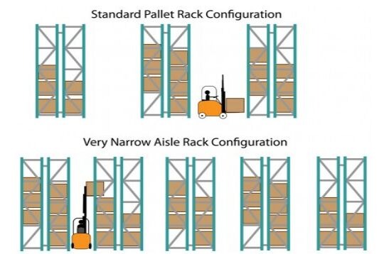 VNA pallet rack is a kind of selective pallet racking system with a very narrow aisles designed to reduce the wasted space in picking aisles by using a special VNA truck which goes through the aisles using a special guide wheels which guides the machine through its way inside the aisle thanks to the guiding system used. VNA pallet rack provides 100% pallet selectivity which help to be one of the most effective systems when a warehouse is dealing with different SKUs at the same time such as Raw Materials warehouses. In narrow aisle racking systems, the aisles are narrowed in order to use the storage volume horizontally and more efficiently.